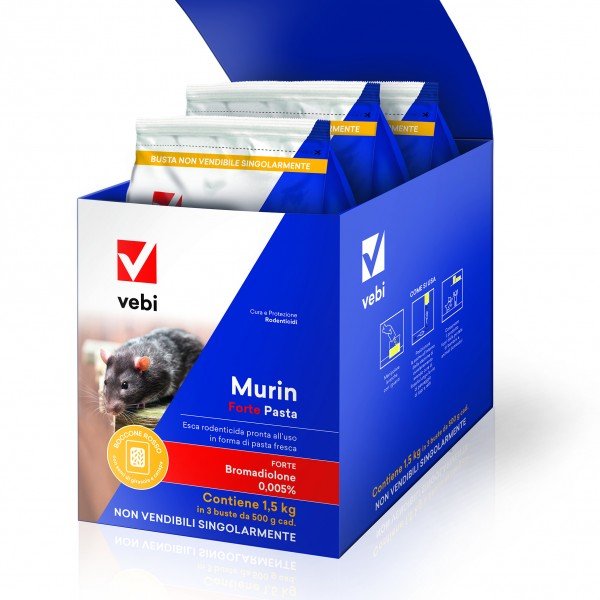 MURIN FORTE PASTA è un’esca rodenticida pronta all’uso a base di Bromadiolone, efficace contro topi e ratti anche dopo una singola ingestione. La particolare formulazione in impasto morbido, grasso, ma non unto, è ottenuta con speciali componenti tra cui semi di girasole e di canapa, ed è stata studiata per ottenere la massima efficacia verso tutte le specie di roditori sopra riportate, anche in presenza di forte competizione alimentare. MURIN FORTE PASTA può essere usato all’interno e intorno a edifici industriali (inclusi magazzini, deposito, stive delle navi), rurali, civili, abitazioni, cantine, garage, ripostigli, giardini di pertinenza e aree di deposito rifiuti.