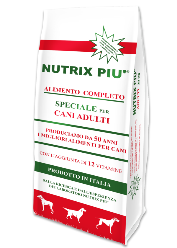 Decenni di ricerca, studio e controlli sul campo condensati in un’unica crocchetta. Nutrix Più per Cani Adulti è un alimento completo e bilanciato, formulato per coprire ogni esigenza fisiologica e nutrizionale del cane adulto di qualsiasi taglia con normale attività motoria. Un prodotto versatile, pensato per essere somministrato da solo — perché contiene già tutto ciò di cui il tuo cane ha bisogno.
