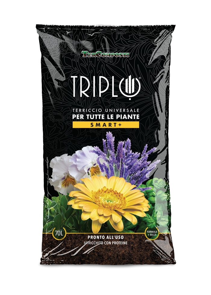 TRIPLO SMART+, è un terriccio universale dalla formulazione professionale, facile da utilizzare, adatto a tutte le piante, siano esse fiorite, da frutto o da orto, comprese le aromatiche. La sua miscela è arricchita con proteine e amminoacidi basici per uno sviluppo rigoglioso delle piante coltivate in giardino, nell’orto, in vaso e fioriere.