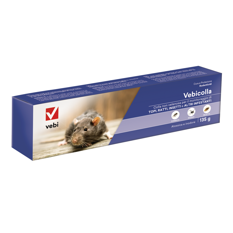 VEBICOLLA è una colla viscosa e densa ad alta appiccicosità . É attossica, inodore e non infiammabile. di facile e pratico impiego, VEBICOLLA mantiene nel tempo le proprie capacità collanti, anche se esposta alle intemperie. consente la cattura in tempi brevi. VEBICOLLA va spalmata su superfici rigide e non assorbenti (come cartone, legno etc.) e posizionata lungo i percorsi abituali di topi, ratti, ragni, blatte e formiche.